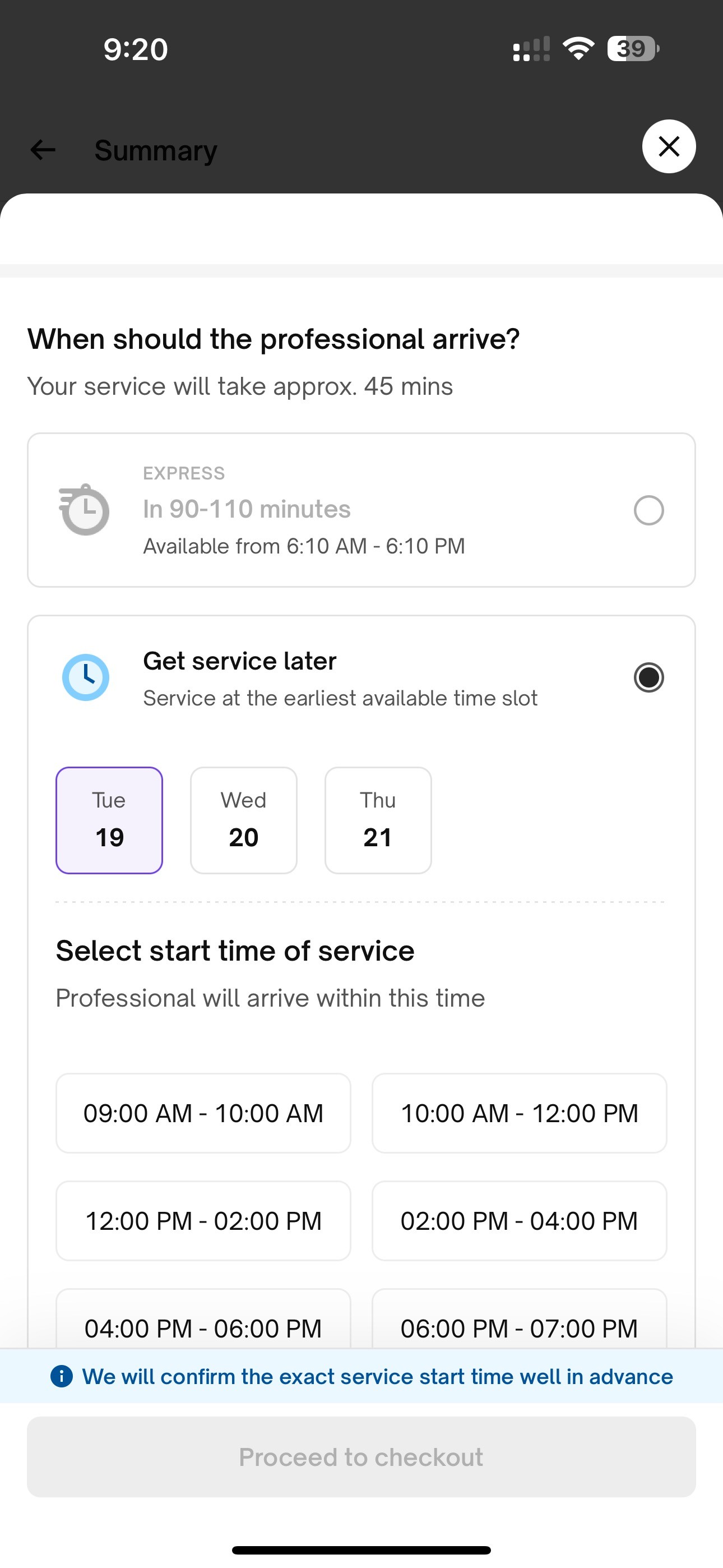 Users only learn about the service hours after attempting to book, which can be annoying and inconvenient.
