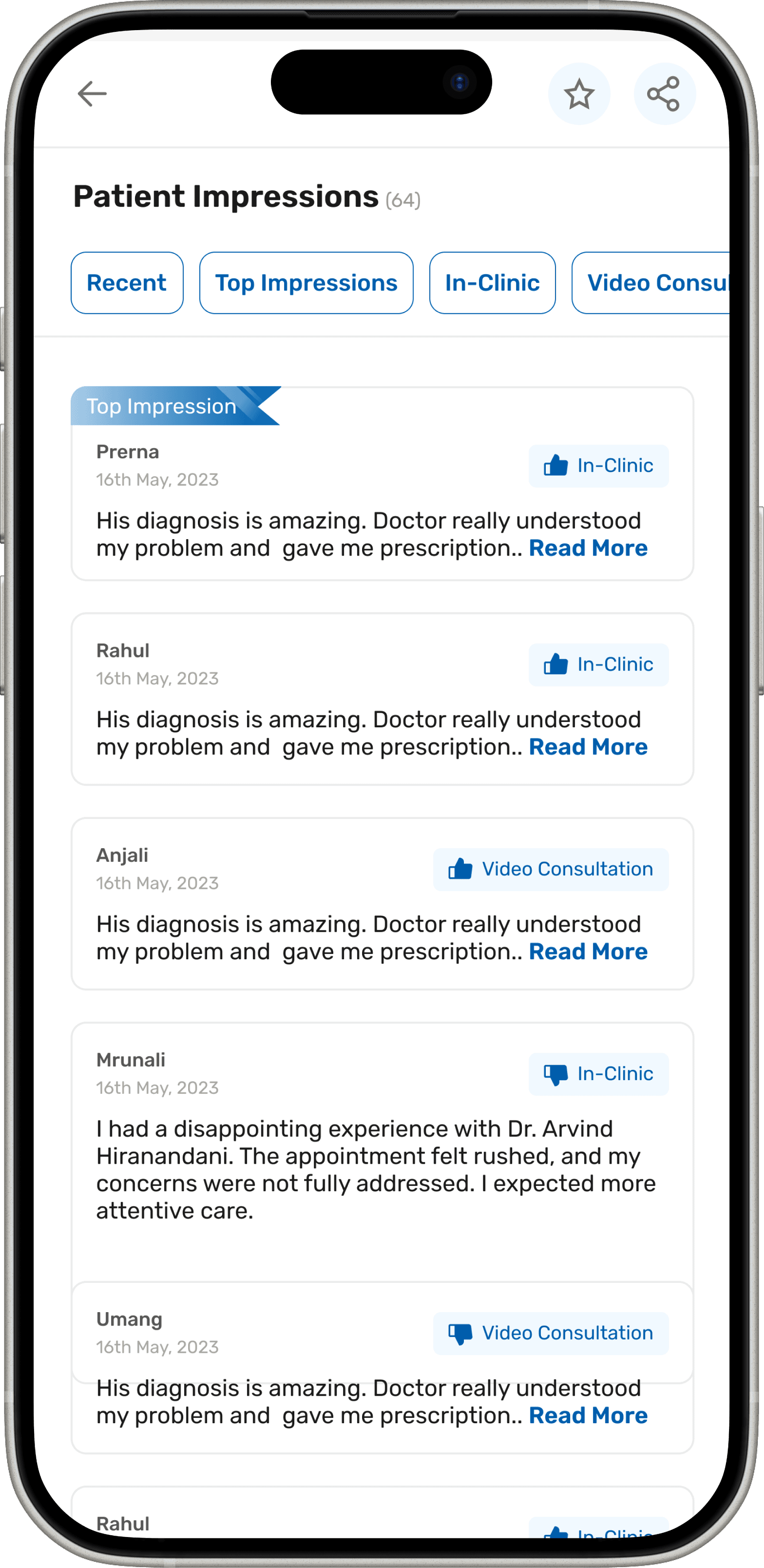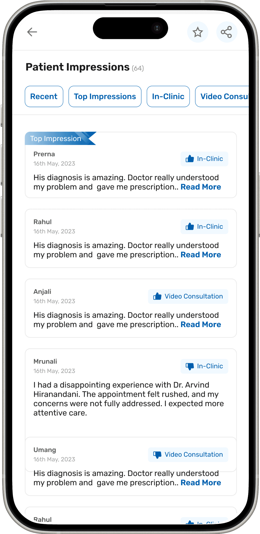 To show empathy and maintain positivity, we present doctor ratings as percentages rather than simple likes or dislikes. This approach highlights the overall satisfaction and instills confidence in patients seeking care.