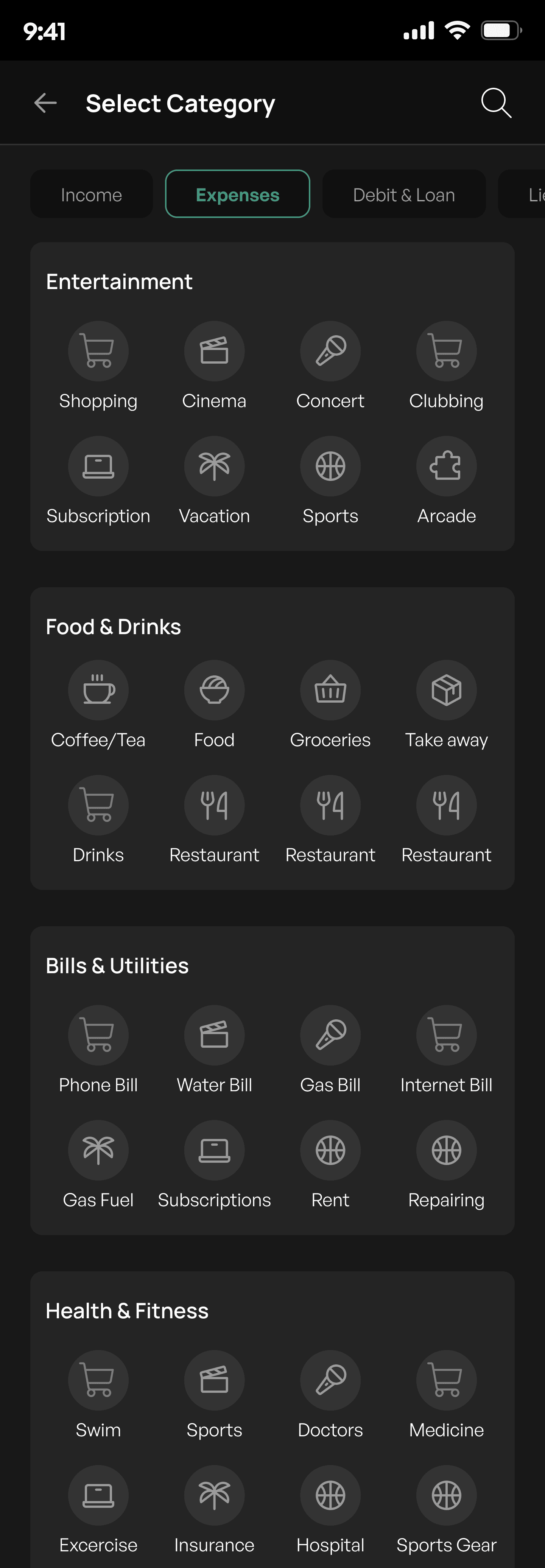 Transactions include icons that visually represent the nature of each expense