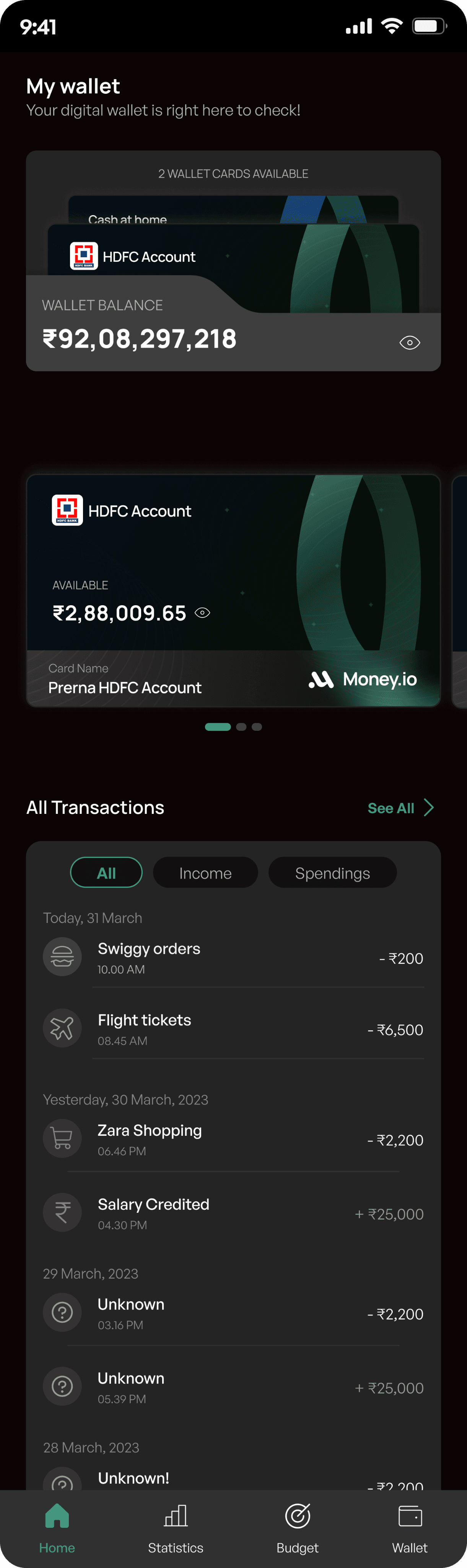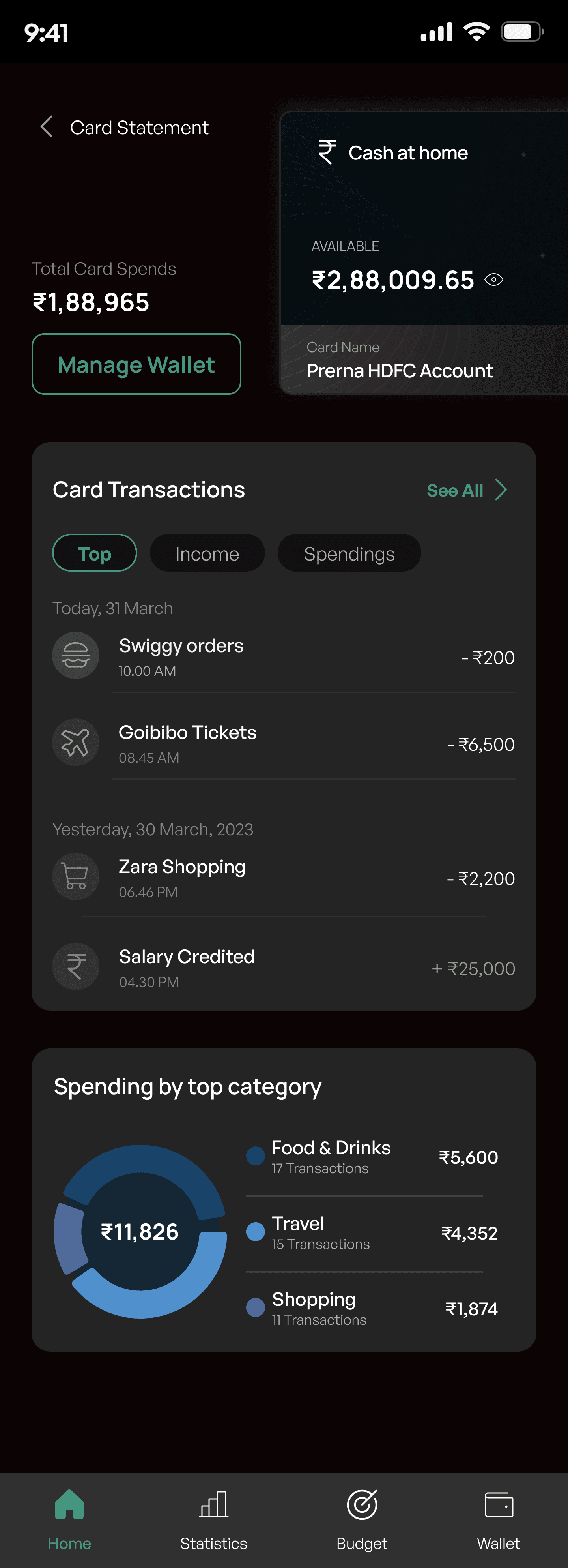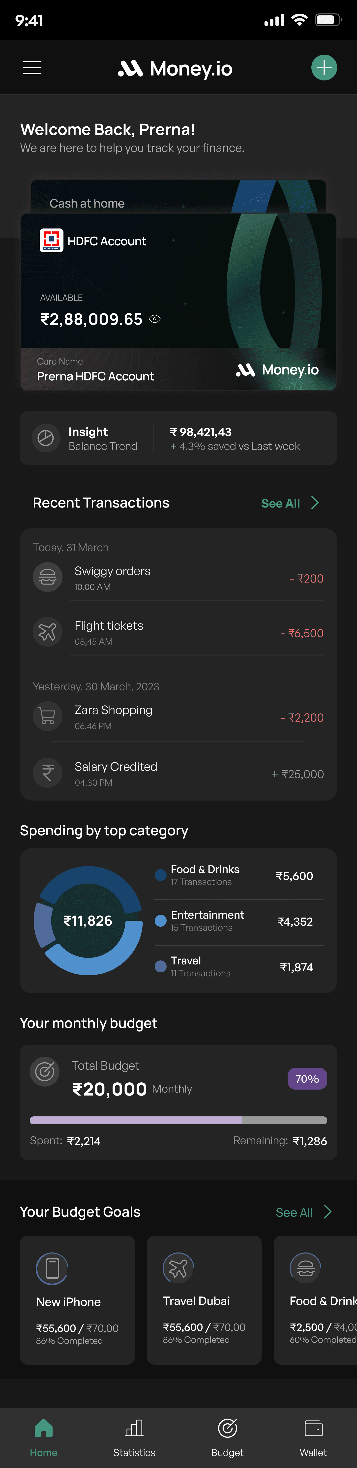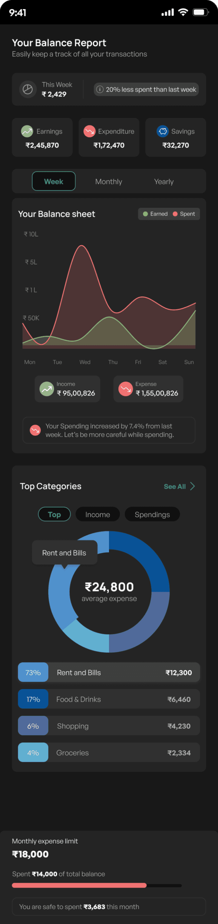 A categories transaction list (All, Income, Spendings) allows users to track their spending and income efficently