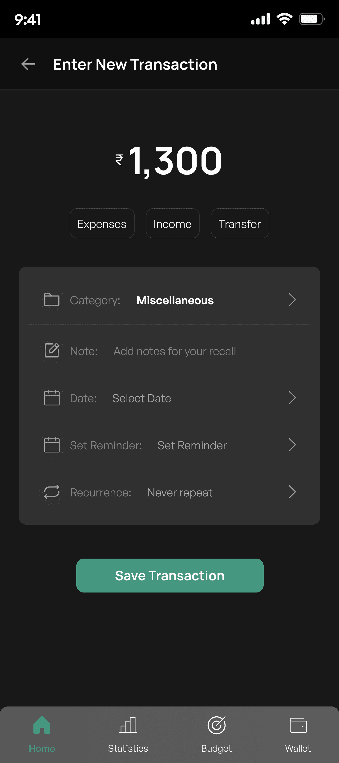 For users to add a new transaction entry into their financial records. It allows users to specify the transaction type (Expenses, Income, or Transfer), the amount, and relevant details such as the category, notes, date, reminders, and recurrence.