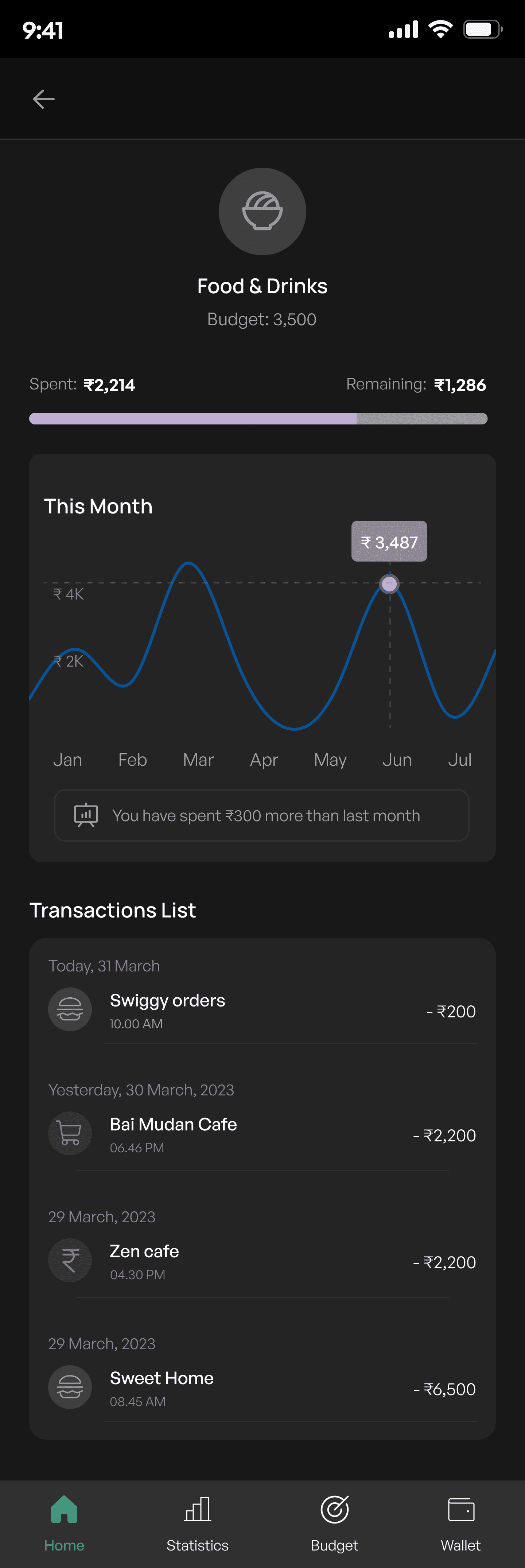 A detailed list of transactions within the category, sorted by date, shows each transaction's description, date, time, and amount spent.